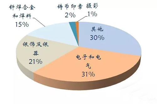 銀主要應(yīng)用于工業(yè)、醫(yī)學(xué)、首飾3個(gè)方面。我國(guó)銀的主要用于電子電器工業(yè)、焊接合金以及首飾加工等。2014年中國(guó)銀儲(chǔ)量4.3萬(wàn)噸,產(chǎn)量4200噸。