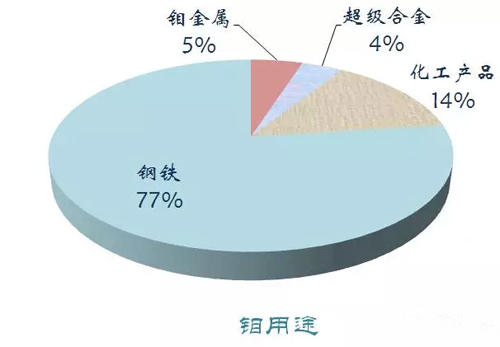鋼鐵行業(yè)是鉬的主要消費(fèi)領(lǐng)域,其消費(fèi)量占中國(guó)鉬總消費(fèi)量的75%以上。2014年我國(guó)鉬儲(chǔ)量430萬(wàn)噸,產(chǎn)量10萬(wàn)噸。
