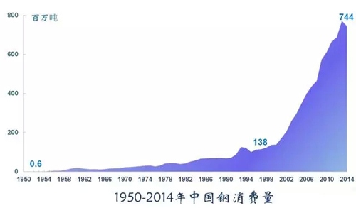 鋼鐵用量約占金屬消費(fèi)的75%,是工業(yè)的骨骼。鋼鐵是工業(yè)化過(guò)程中最重要的原材料之一,2014年中國(guó)消費(fèi)鋼鐵7.44億噸,是建國(guó)時(shí)的1240倍。